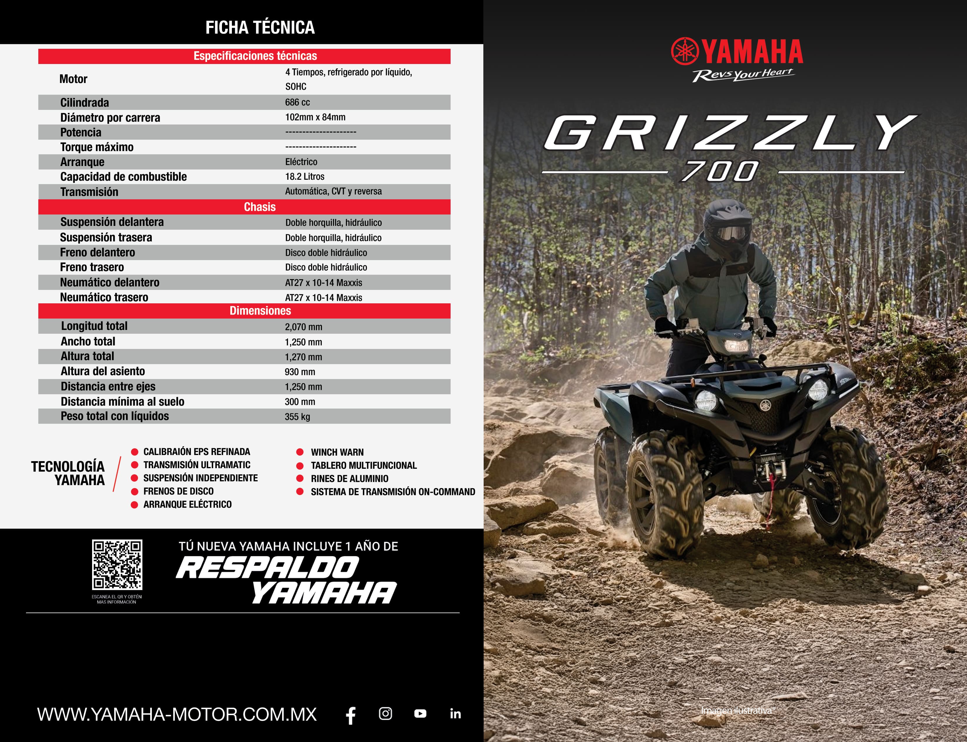 Diseñada para la máxima resistencia y funcionalidad, la Grizzly EPS XT-R incorpora un radiador de alta capacidad con asistencia de ventilador, un tanque de combustible de 18 litros ubicado bajo el asiento para una mejor centralización de masas y mayor estabilidad, además de iluminación LED de alto rendimiento. El paquete XT-R incluye malacate WARN®, rines de aluminio de 27 pulgadas, junto con un tablero digital LCD de alta visibilidad, luz de trabajo montada en el manillar, compartimentos de almacenamiento, toma de corriente de 12V.