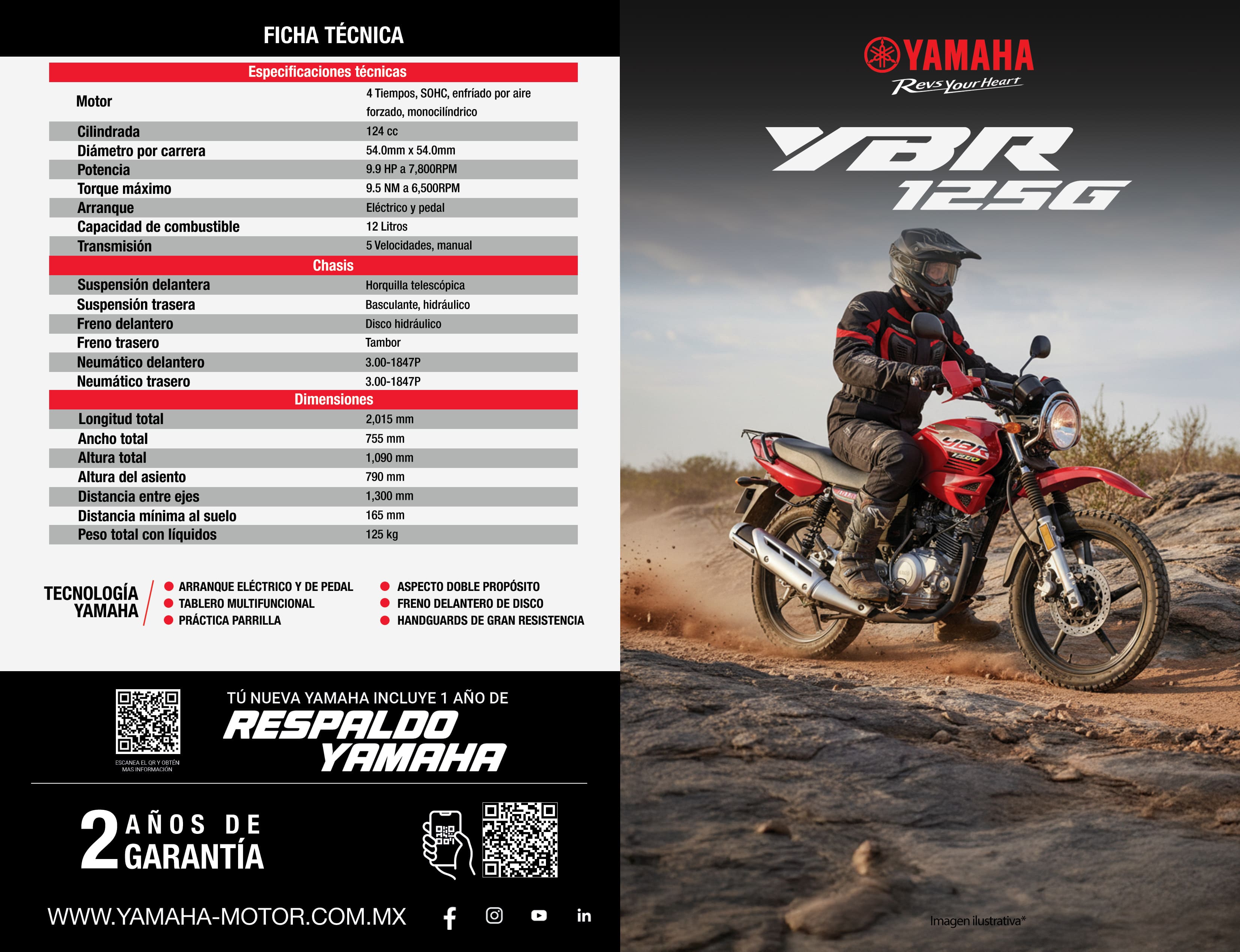 La Yamaha YBR 125G nace como una motocicleta de doble propósito, diseñada para conquistar tanto caminos asfaltados como de terracería. Perfecta para el segmento de doble propósito, esta moto ofrece una combinación excepcional de precio, velocidad, y potencia, haciendo de ella una opción ideal para la ciudad y más allá.