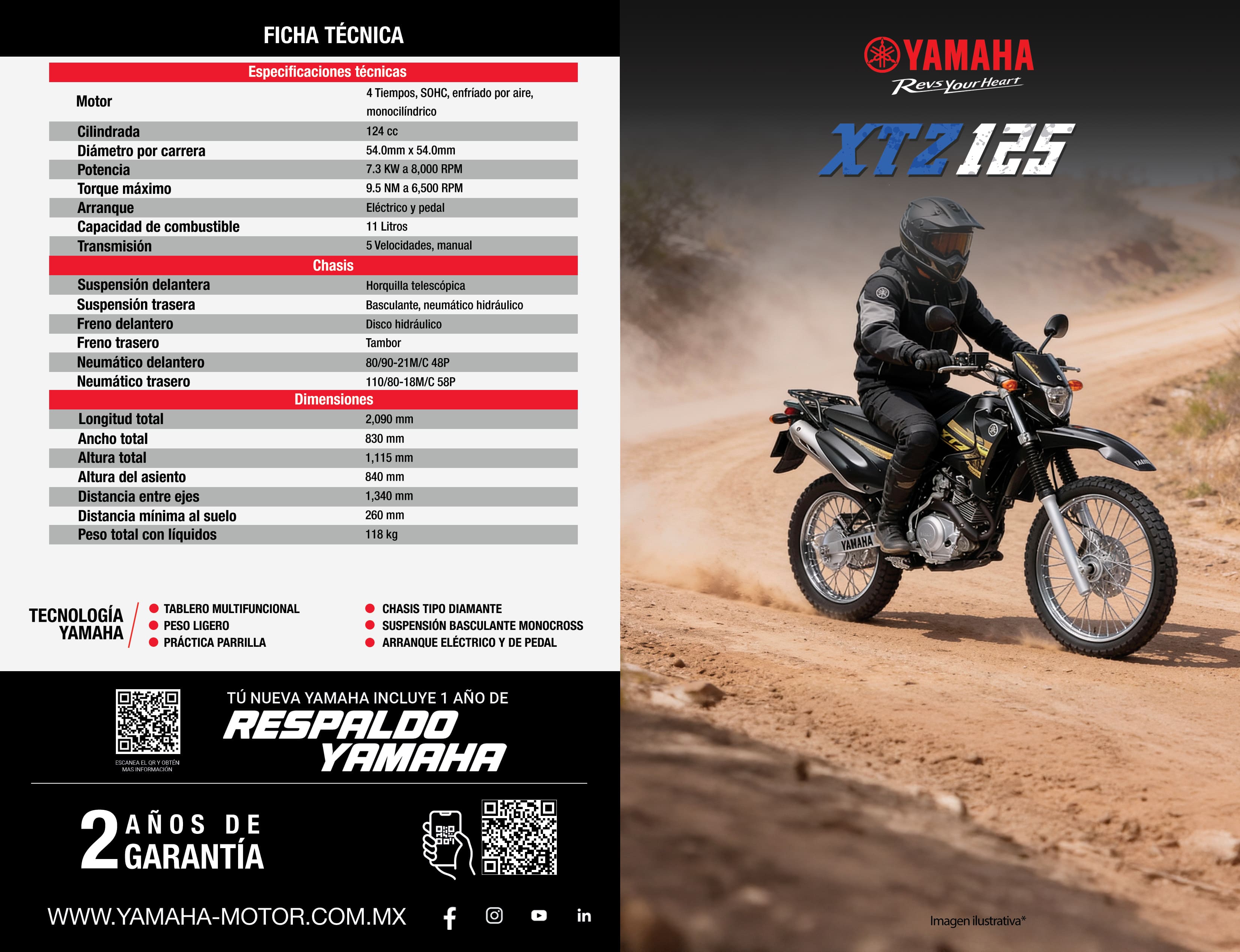La XTZ 125 es más que una motocicleta; es tu compañera ideal para cualquier aventura. Con su mezcla de velocidad, potencia, y ahorro de combustible, esta moto es perfecta para quienes buscan un vehículo confiable y versátil. Descubre la libertad de rodar con Yamaha y lleva tu experiencia de conducción a un nuevo nivel