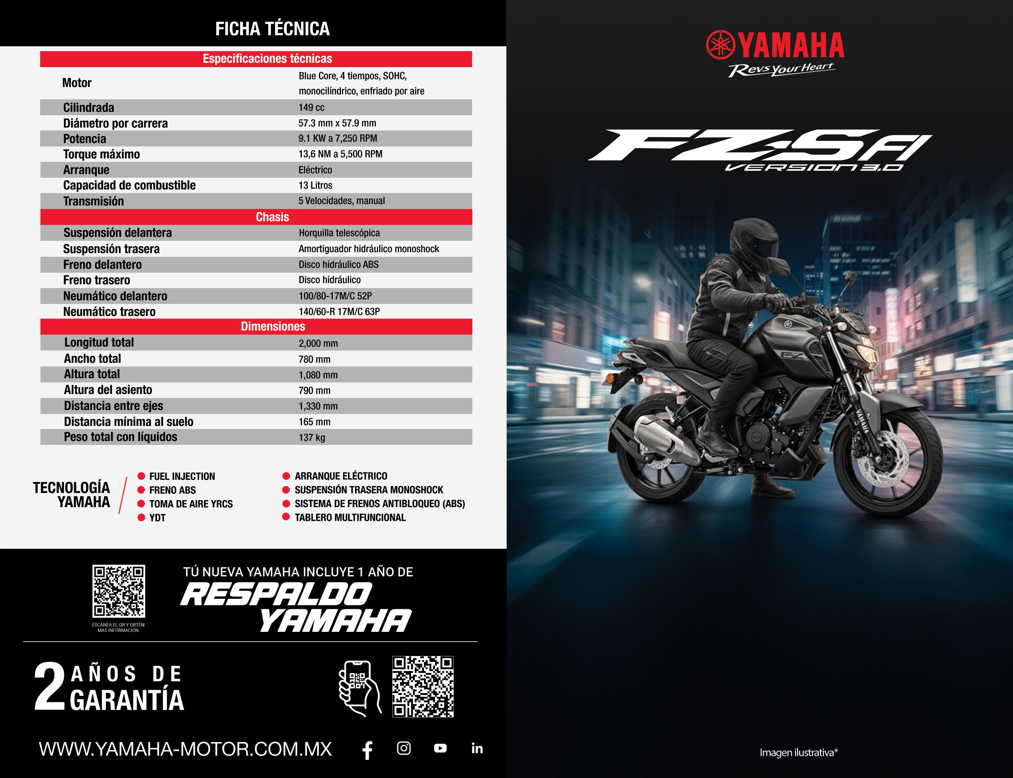 Cada componente de la FZ 3.0 no solo es funcional, sino que también comunica visualmente su propósito. Esta motocicleta es perfecta para quienes buscan rendimiento, estilo y ahorro de combustible, todo en una sola máquina.